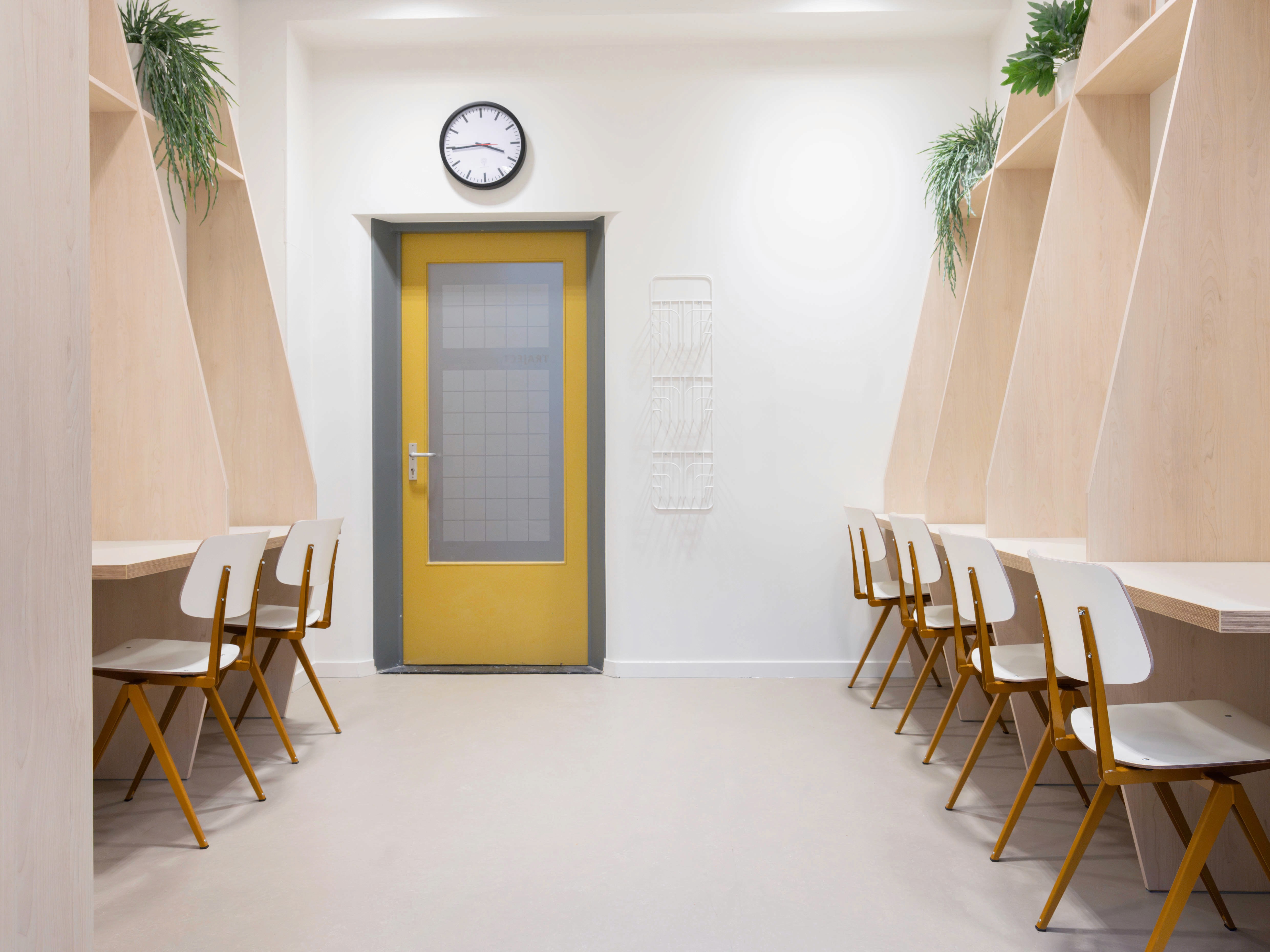 De study area is een lichte, open ruimte waar leerlingen in alle rust kunnen leren, werken en zich ontwikkelen. Slimme indeling, maatwerkmeubilair en subtiele decoratie maken het tot een inspirerende leeromgeving.