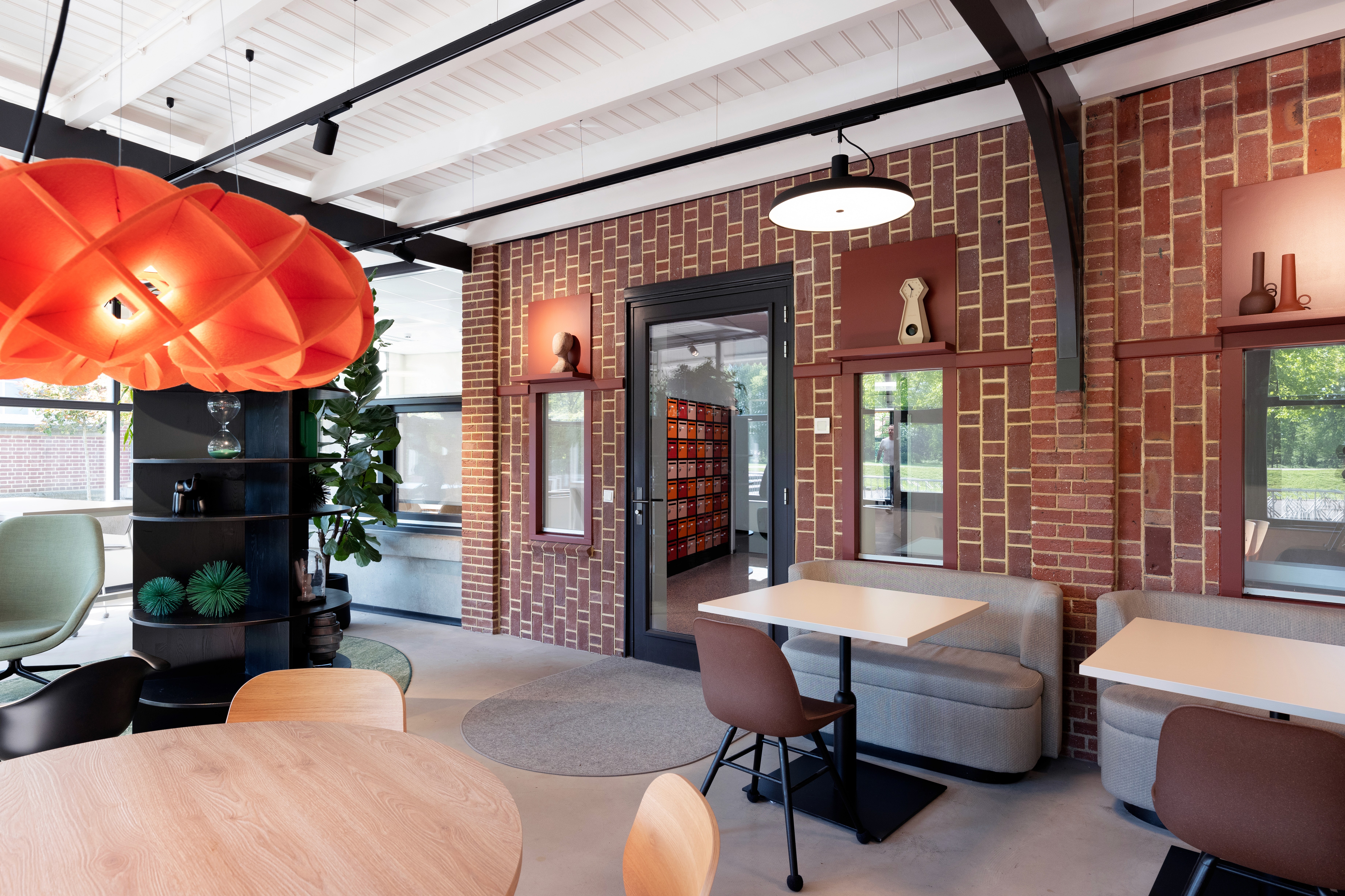 De ruimte is ingericht met een combinatie van zachte grijstinten, fris grasgroen en warm oranje. Deze kleuren zorgen niet alleen voor energie en warmte, maar geven de ruimte ook een visueel gebalanceerd karakter. Het meubilair van Satelliet en de verlichting van onder meer InZee dragen bij aan het comfort en de functionaliteit van de werkplek.