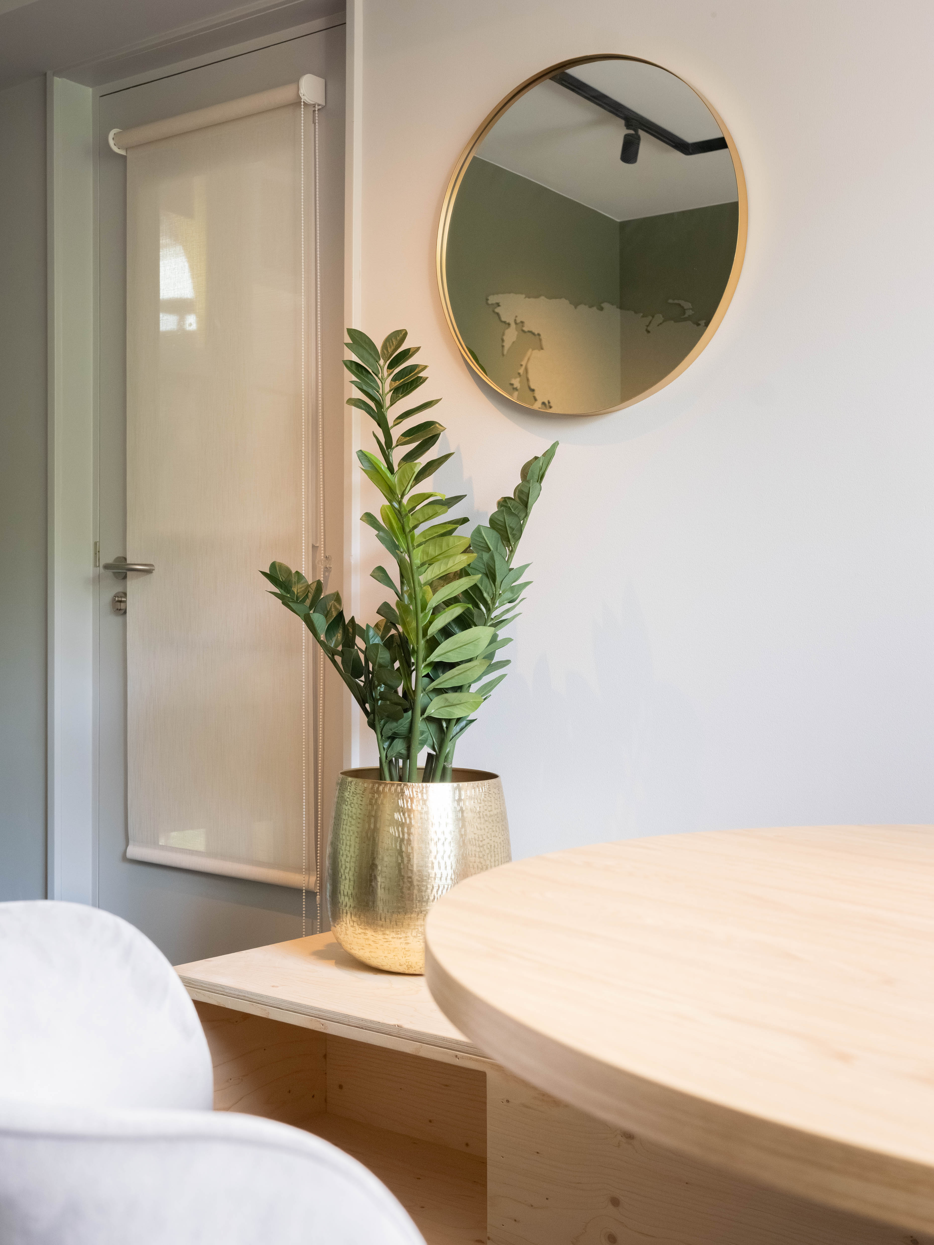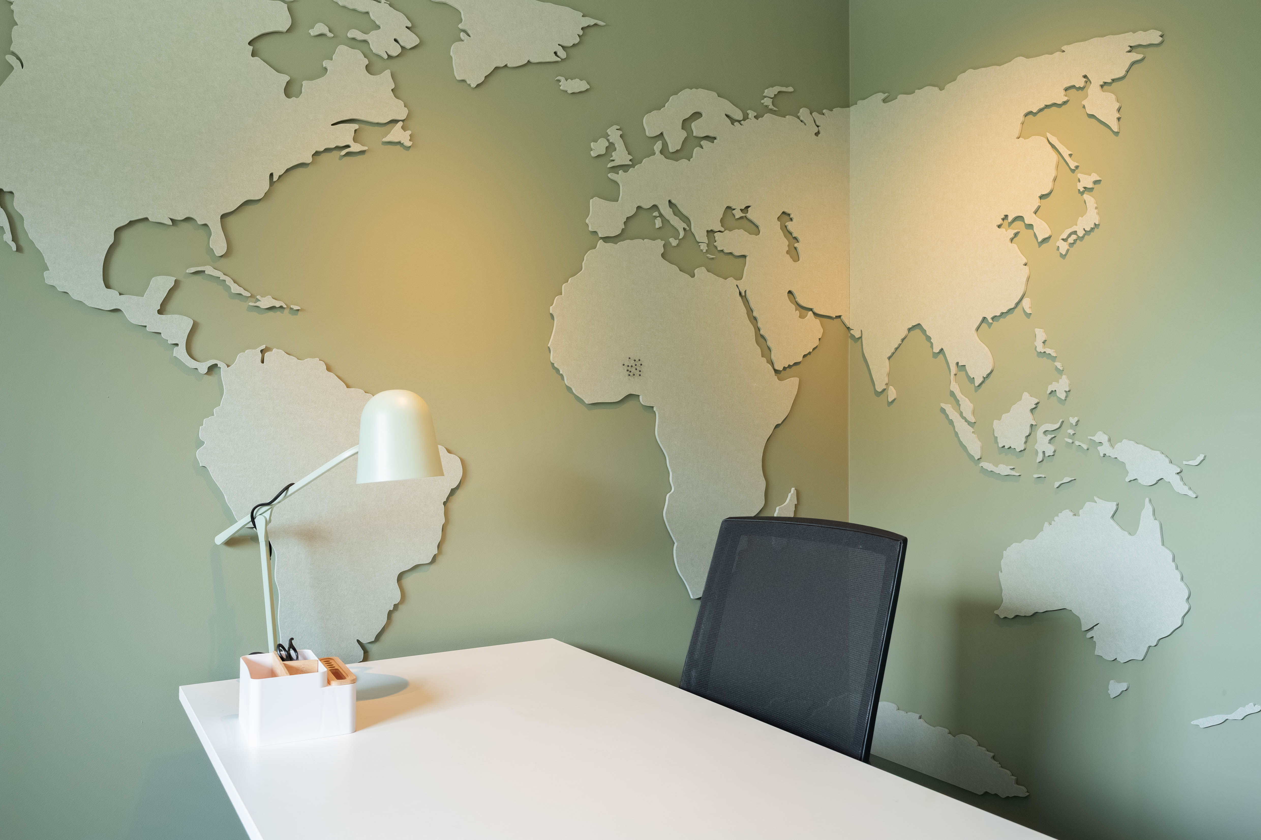 Samen met de gebruikers is per kantoor gekeken naar de specifieke wensen en functies. Zo kreeg iedere ruimte een unieke invulling, steeds passend binnen de identiteit van de school. De groene en grijstinten creëren een rustige werkomgeving, terwijl subtiele accenten van goud zorgen voor een smaakvol geheel.