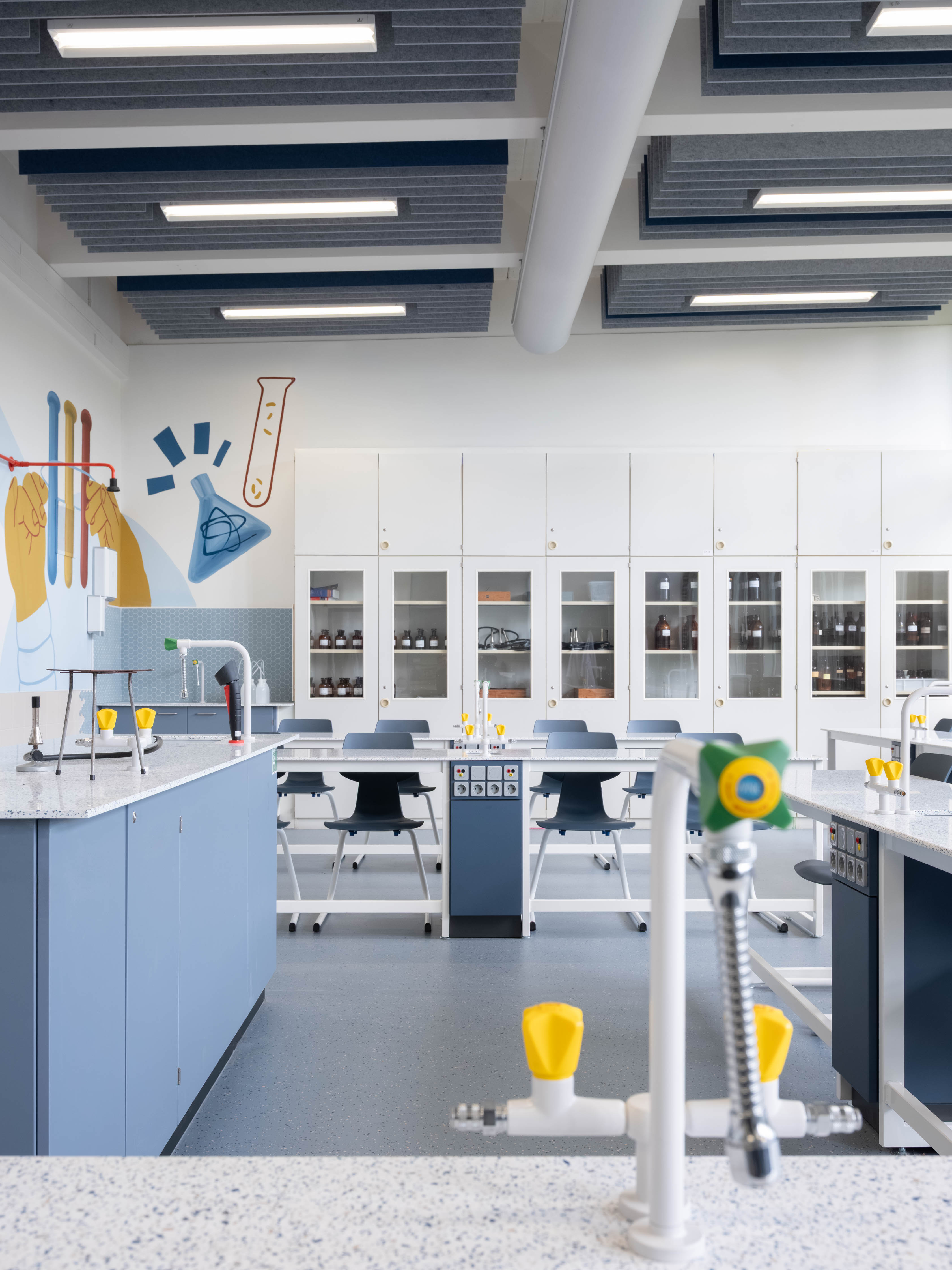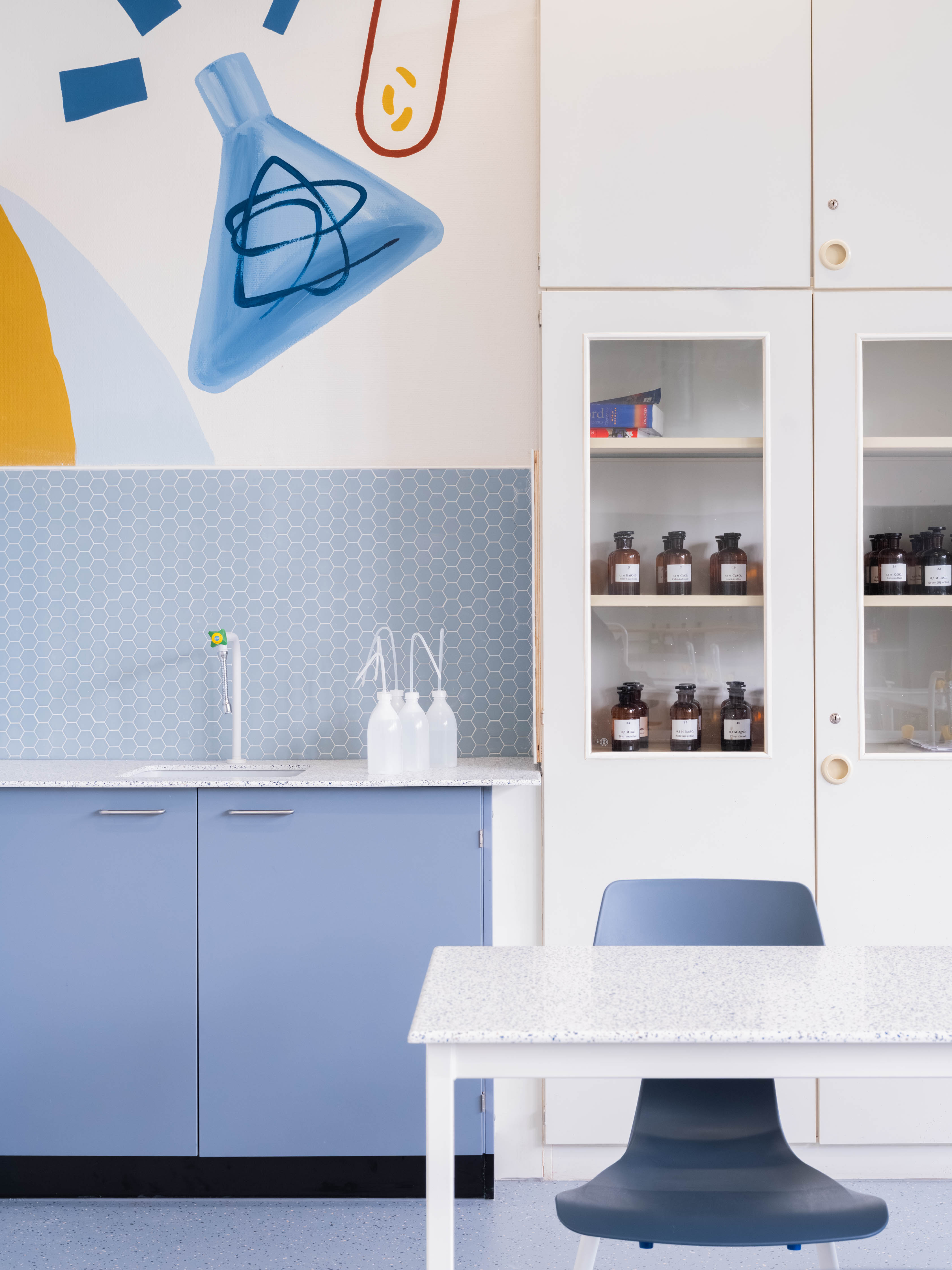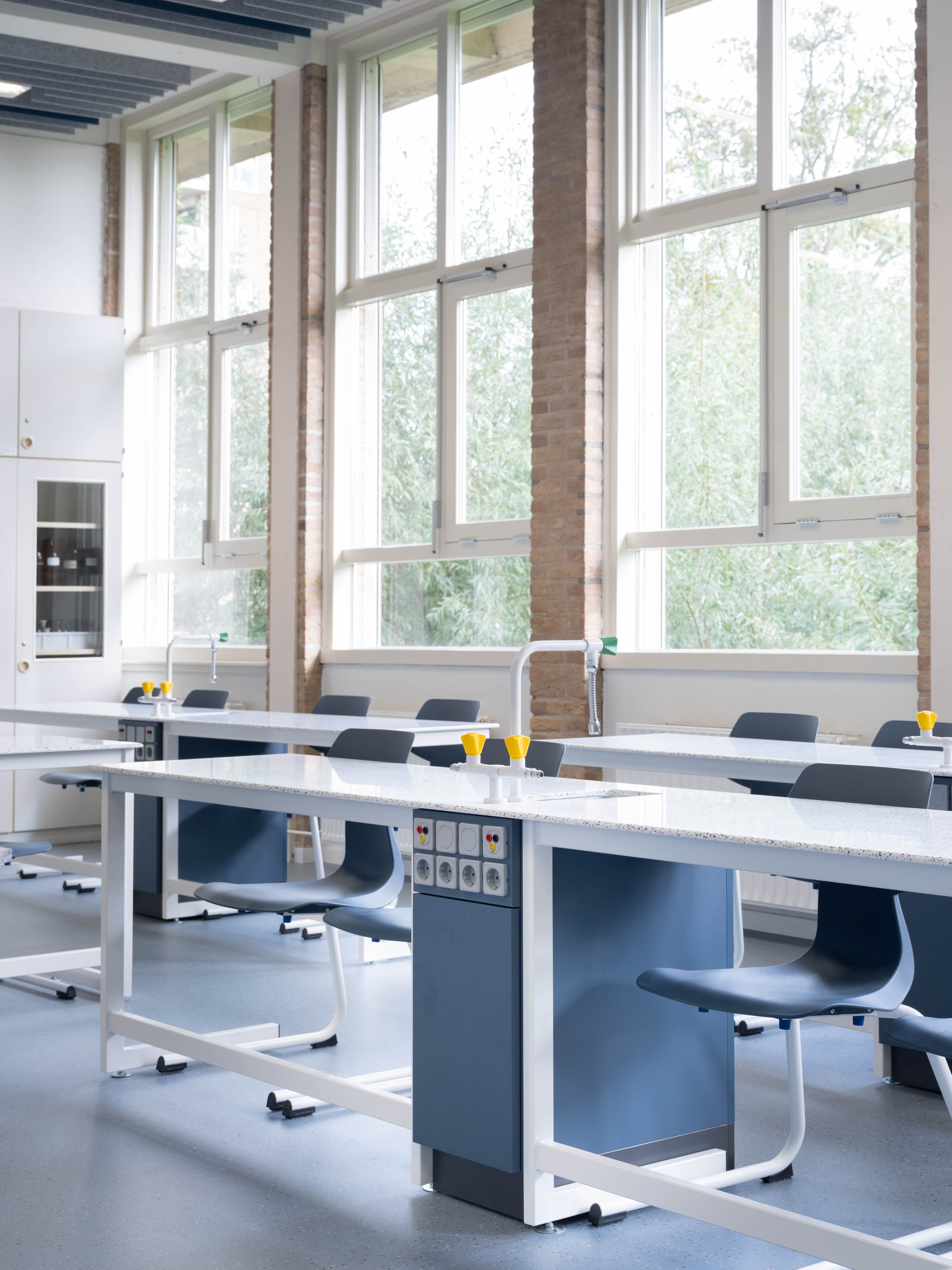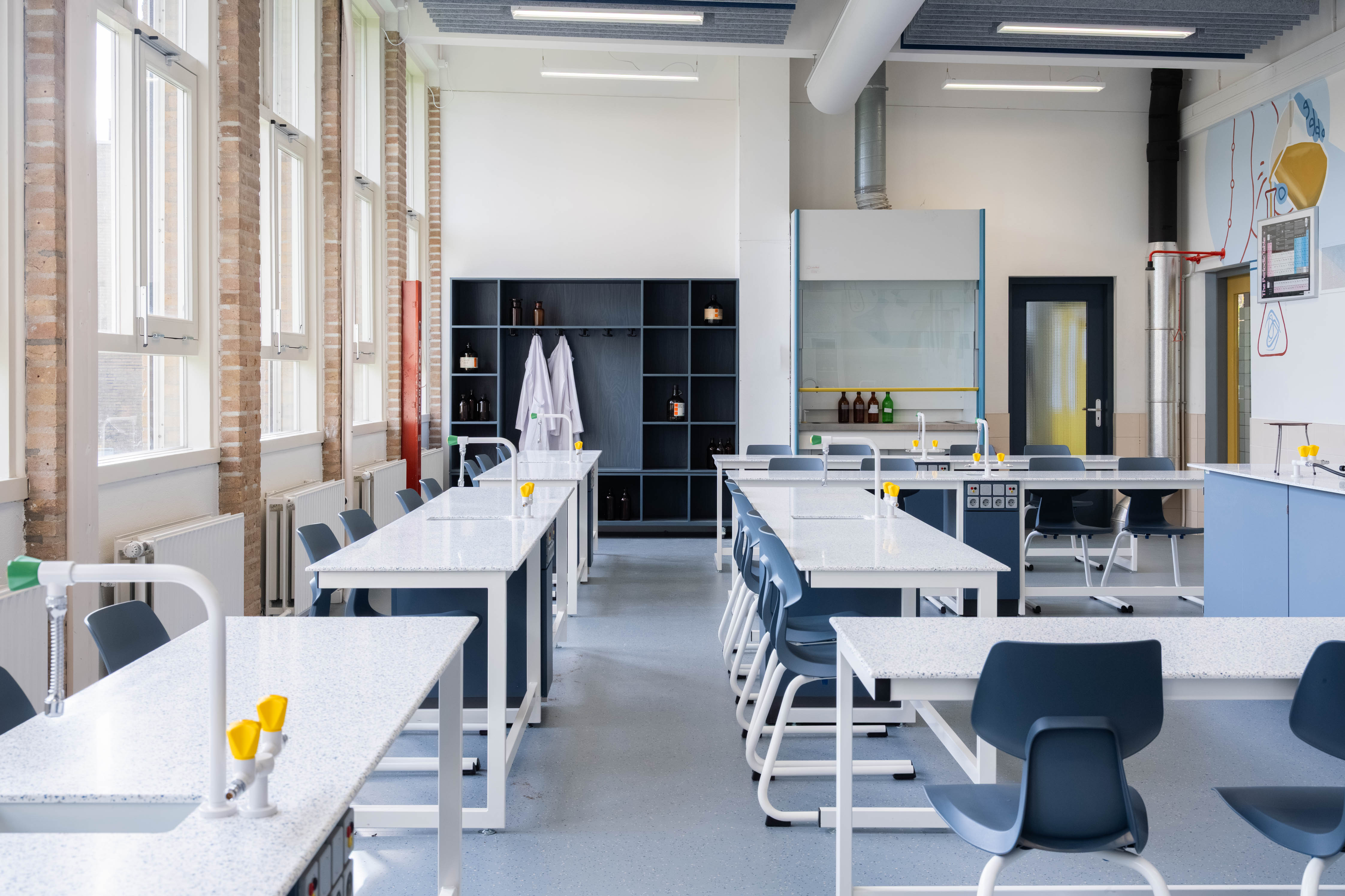 Een frisse update van de scheikundelokalen van het Mendelcollege, met een vertrouwde opzet, speelse accenten en merkbaar betere akoestiek.